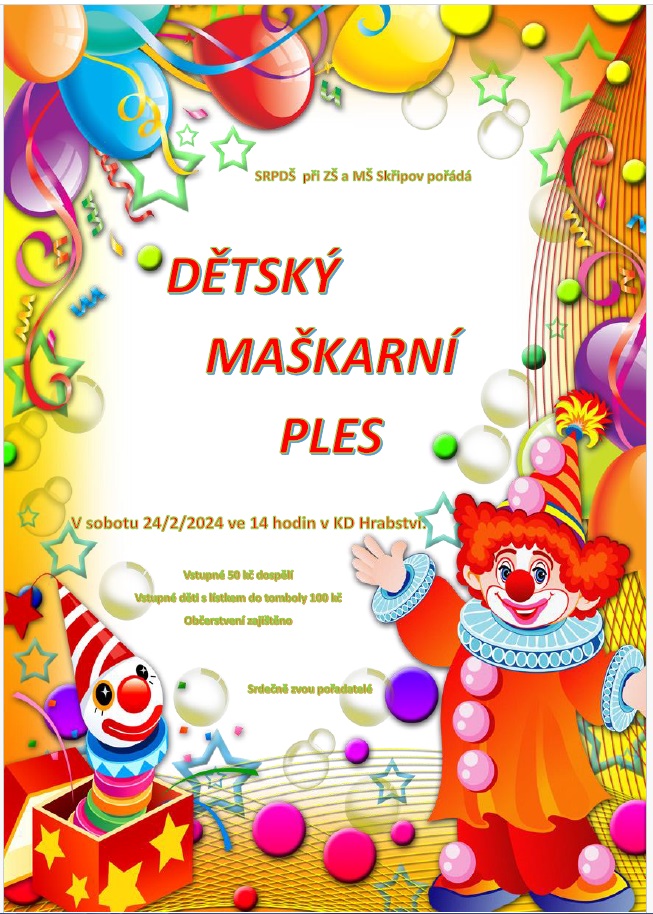 24.2.2024 pořádá SRPDŠ při ZŠ a MŠ Skřipov maškarní ples pro děti.